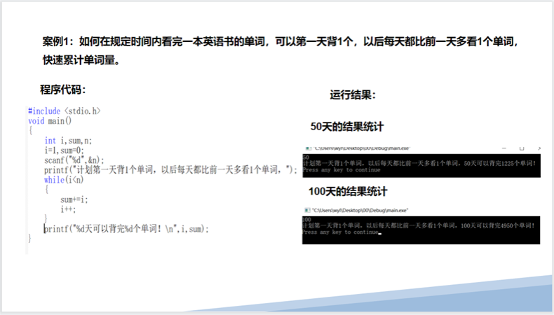 在工程与技术学院王艳丽老师的《程序设计》课程中循环结构的讲解时。在具体的课堂设计过程中,教师可采用案例教学的方法实现相关语句。例如,如何在规定时间内看完一本英语书的单词,可以第一天背1个,以后每天都比前一天多看1个单词,通过这样的一个累计过程,可以快速的累计单词量。又如,1.1的100次方的结果比0.99的100次方的结果大得多,而循环过程就是告诉要不断循环累计,以达到目标。在break和continue语句的设计过程中,同样可以穿插目标终止break和目标继续,进而引出当目标被中断后,不放弃继续努力的精神品质。
