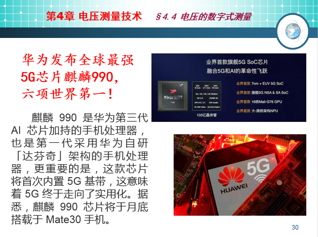 在工程与技术学院梁瑞老师的《电子测量》课程中,在讲解第四章第4.4节时,主要知识点为数字电压表的设计。由于数字电压表的核心是微处理器,是芯片,而目前我国芯片受到欧洲国家的打压,美国以种种理由为借口,做出停止向我国出售芯片的制裁。而以华为为代表的中国企业,在受到美国的封锁打压下,发扬艰苦奋斗精神,克服重重困难,终于研制出了引领世界的5G芯片,如麒麟990,使我国在5G技术上有了真正的话语权和较强的竞争力。当学生了解到这些情况后,自然会在心里默默地为我国所取得的成就感到很自豪和骄傲。接着让学生明白:科技兴则民族兴,科技强则国强,核心技术是国之重器。没有强大的科技支撑,就不可能实现国家富强、民族振兴、人民幸福的中国梦。并且无论是引进还是自主研发核心技术,都不是那么容易的,要知道落后就要挨打,鼓励学生珍惜时光,脚踏实地,奋发学习。