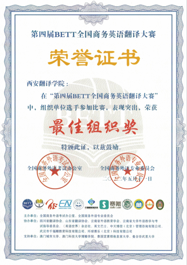 在近日结束的第四届BETT全国商务英语翻译大赛中,西译学子在笔译总决赛和口译总决赛中包揽专科口译组特等奖和一等奖,并获得笔译组专、本科奖项11项。指导老师魏征获得“优秀辅导教师奖”,西安翻译学院获得“最佳组织奖”。