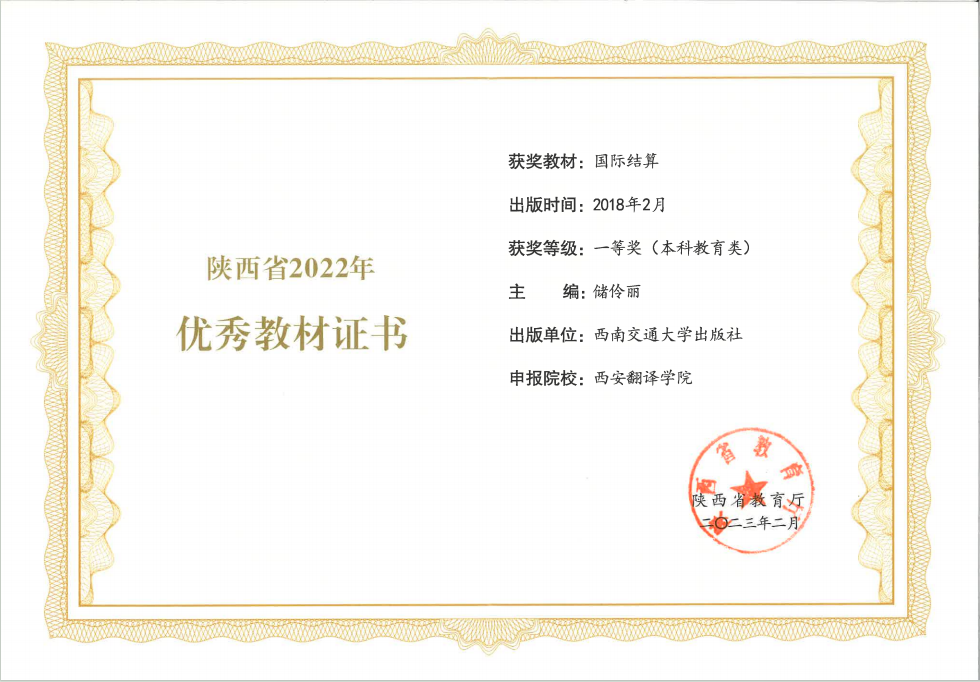 2023年2月14日,陕西省教育厅发布《关于陕西省2022年职业教育和高等教育优秀教材获奖名单的通知》(陕教函〔2023〕111号),我校国际商学院教师储伶丽主编的《国际结算》获得高等教育优秀教材一等奖。截至目前,我校共有9部教材获得陕西普通高校优秀教材奖项,其中一等奖2项。