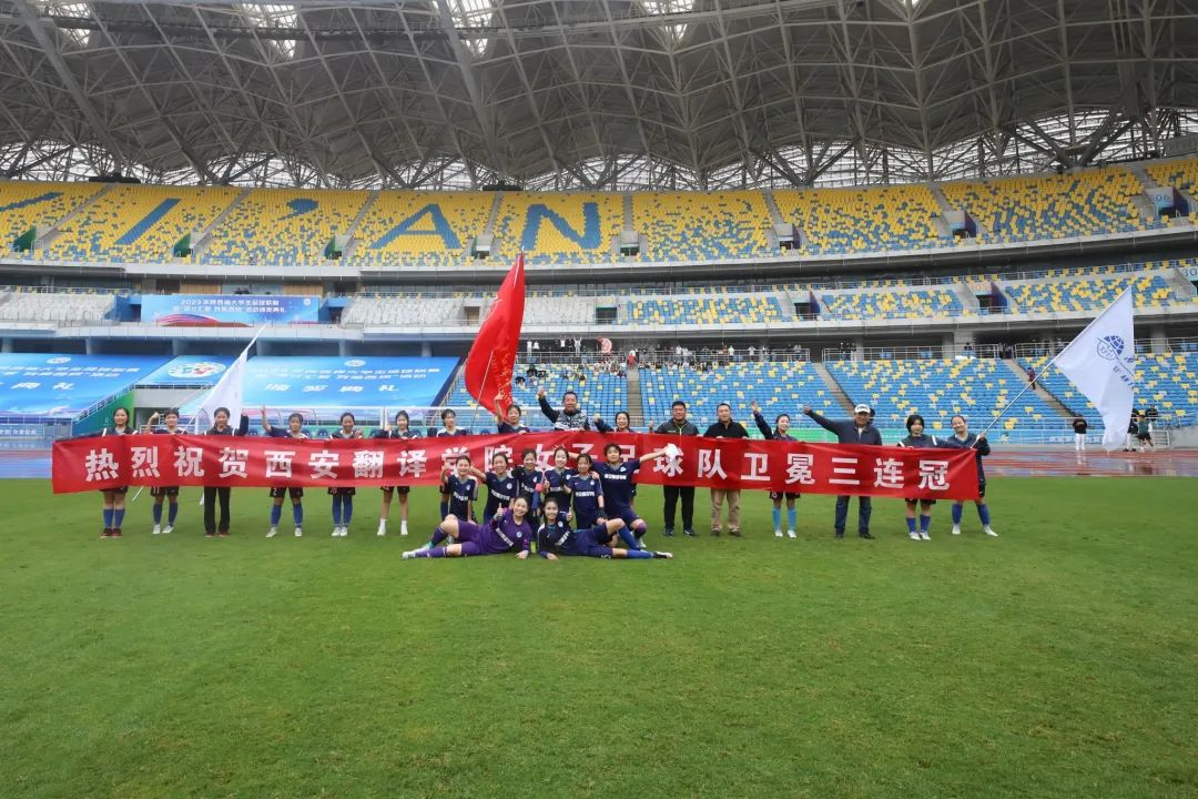 5月29日,2023年陕西省大学生足球联赛举行二级联赛女子组冠亚军争夺赛。西安翻译学院女子足球队以4:0的骄人战绩战胜长安大学女子足球队,强势夺冠。这是西译女足继2021年夺得陕西省大学生校园足球联赛和超级联赛冠军及陕西省第十七届运动会大学生组女子足球比赛冠军后,第三次问鼎省级冠军,再次刷新了比赛纪录。
