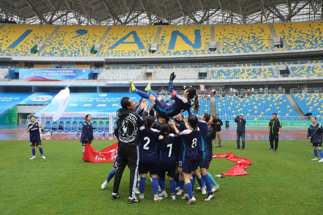 5月8日上午,陕西省校园足球联赛女子足球比赛在西京学院开赛,西安翻译学院女足代表队对战西安理工大学女足队,开启了西译姑娘们在本届大学生校园足球联赛上的首场比赛。经过队员们的奋力拼搏,最终以6:0的比分获胜。5月10日,西译女足与西安文理学院女足对战,以6:0的比分获胜;5月12日,在与西京学院的对战中,西译女足在60分钟内以4:0比分小组第一出线;在5月14日的半决赛中,西译女足与西安交通大学城市学院女子足球队对战,以5:0的比分获胜;5月16日,西译女足在与西安思源学院女子足球队的对决中,以4:0的比分挺进决赛。在5月29日进行的冠亚军争夺赛中,西译女足姑娘们冒着大雨依然坚持奋战在赛场上,以坚定的意志、顽强拼搏的精神,最终以4:0的比分战胜长安大学代表队,问鼎二级联赛女子组足球比赛冠军,登上了2023年陕西省大学生足球联赛的最高领奖台。