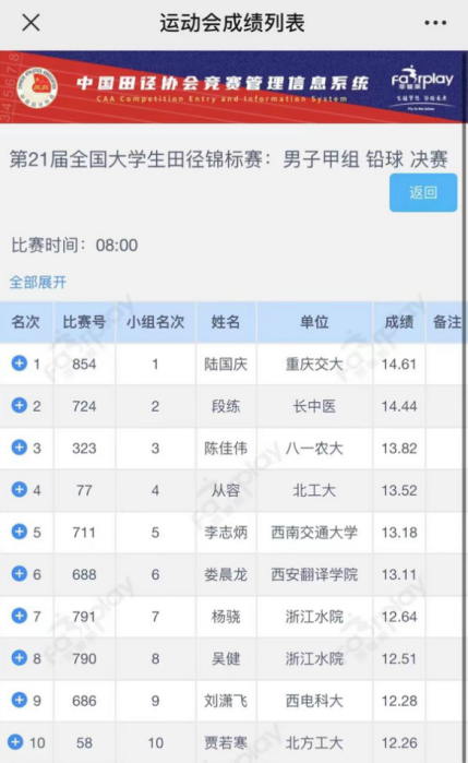 第二十一届全国大学生田径锦标赛8月8日至16日在安徽合肥举行,全国共有390所高校,4800名运动员参加本次大赛,参赛高校与运动员人数创历史新高。我校田径队首次参加全国大学生运动会,派出娄晨龙、王小洲、杨柳参加铅球、标枪、100米栏等项目的比赛,三名运动员在教练员李杰、王远超的带领下奋勇拼搏、超常发挥水平,取得优异成绩。王小洲以39.38米的成绩进入标枪决赛;杨柳以18秒87的成绩取得100米跨栏的小组第四名;娄晨龙以13.11米的成绩最终取得男子甲组铅球第六名,此项成绩是我校田径比赛在全国赛中取得的最好成绩,实现了田径项目的历史性突破。